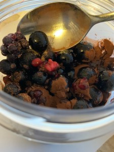 It all started very well. Fantastic concept and all the ingredients to hand. The frozen Morrison’s Wonky blackberries and blackcurrants were separated from the strawberries and put into the ubiquitous smoothie container. And look……